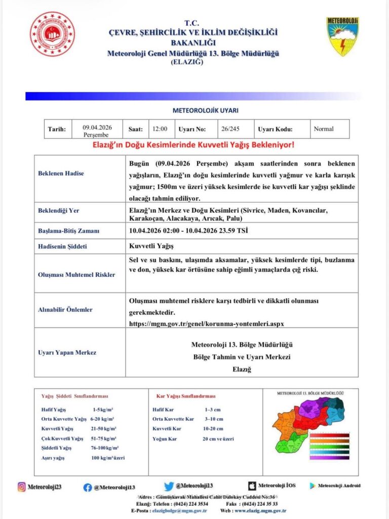 Meteoroloji Genel Müdürlüğü’nden alınan son verilere göre, Elazığ genelinde ve özellikle doğu ilçelerinde hava sıcaklıklarının düşmesiyle birlikte şiddetli yağışlar kapıda. 9 Nisan Perşembe günü akşam saatlerinde başlayacak olan hareketliliğin, Cuma günü gece geç saatlere kadar sürmesi bekleniyor.